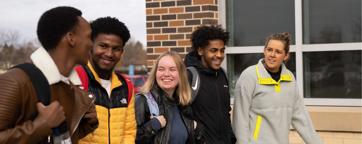 Students stand in front of the M State logo at the Detroit Lakes campus