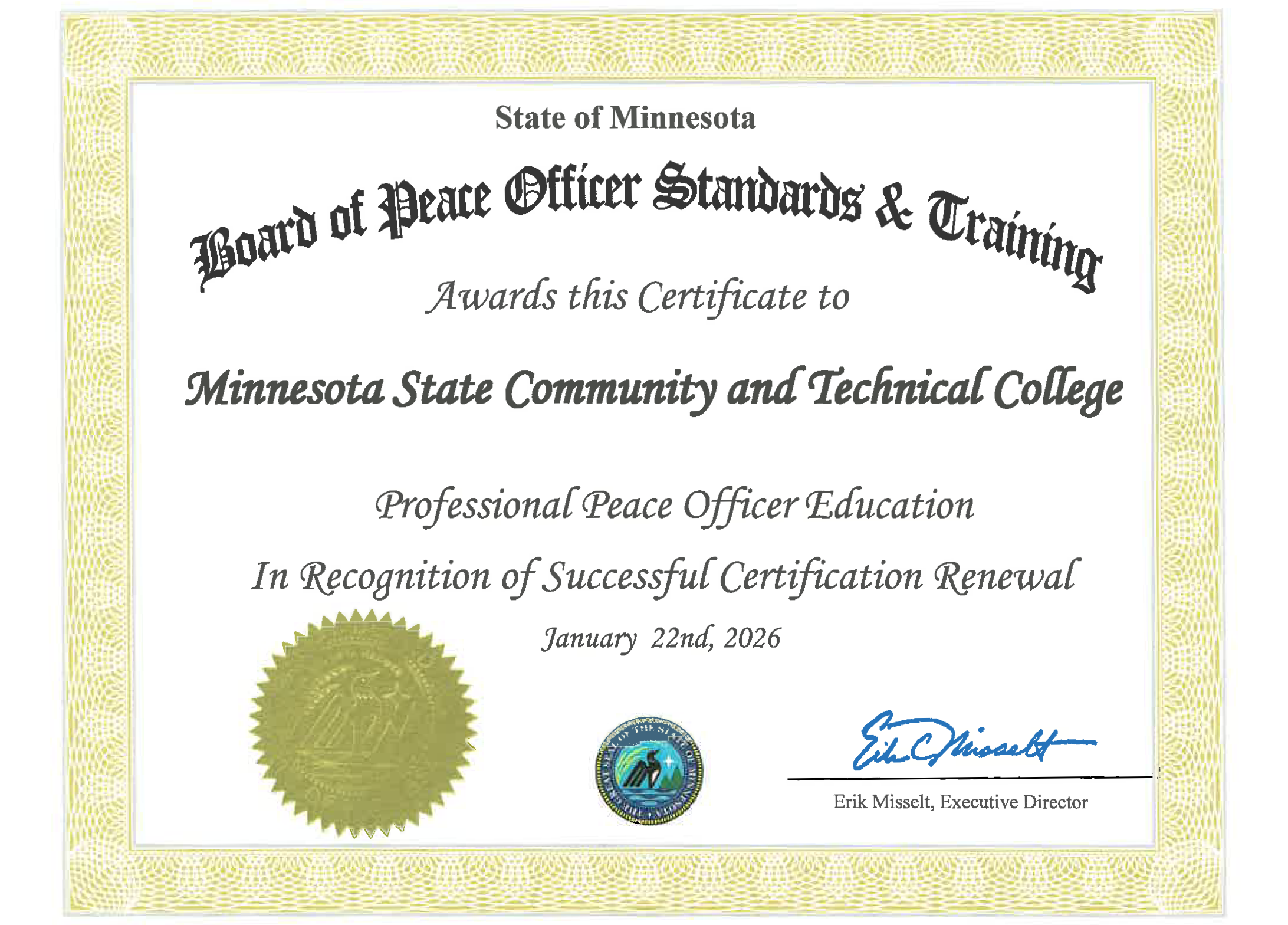M State’s Professional Peace Officer Education program has received recertification from the Minnesota Board of Peace Officer Standards and Training (POST). The recertification is valid for three years and confirms that the program meets state standards for criminal justice education.