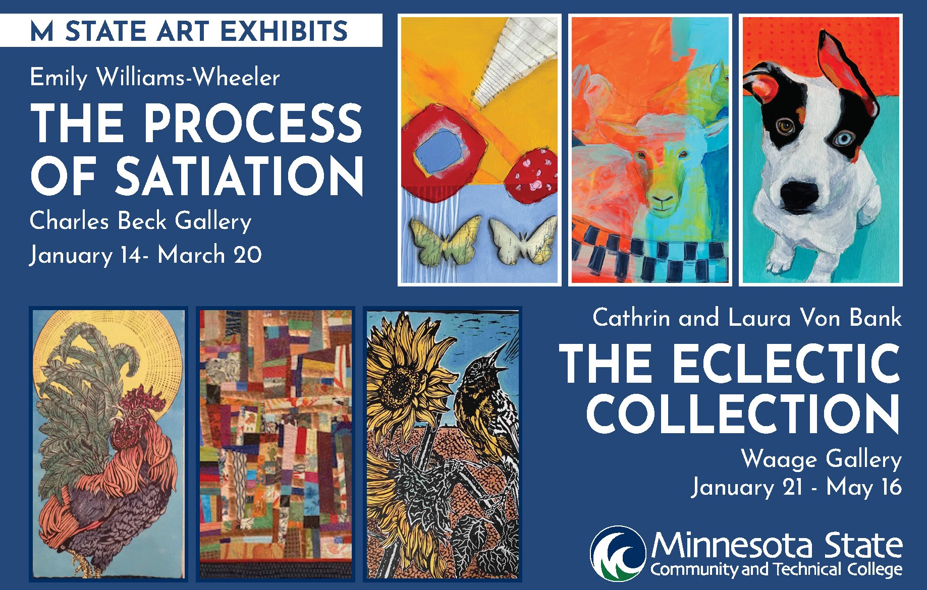M State Fergus Falls will host two art exhibits this winter, highlighting the work of three regional artists. “The Process of Satiation,” a collection of paintings by Emily Williams-Wheeler, will be on display in the Charles Beck Gallery from January 14 through March 20, and “The Eclectic Collection,” featuring linocut prints, portraiture, fiber art and mixed media by sisters Cathrin and Laura Von Bank, will be exhibited in the Waage Gallery from January 21 through May 16.